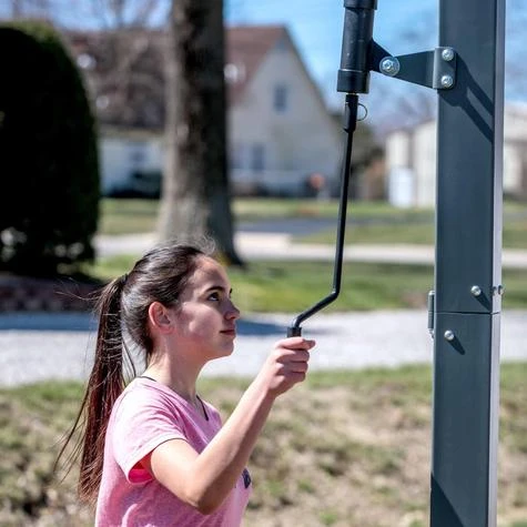 The spring-activated basketball hoop bends under stress to ensure the safety of players and the backboard. A hand-operated crank lets you adjust the height of the basketball hoop from the NBA and FIBA regulation height of 3.05ย m to a safety-approved 2.3ย m.